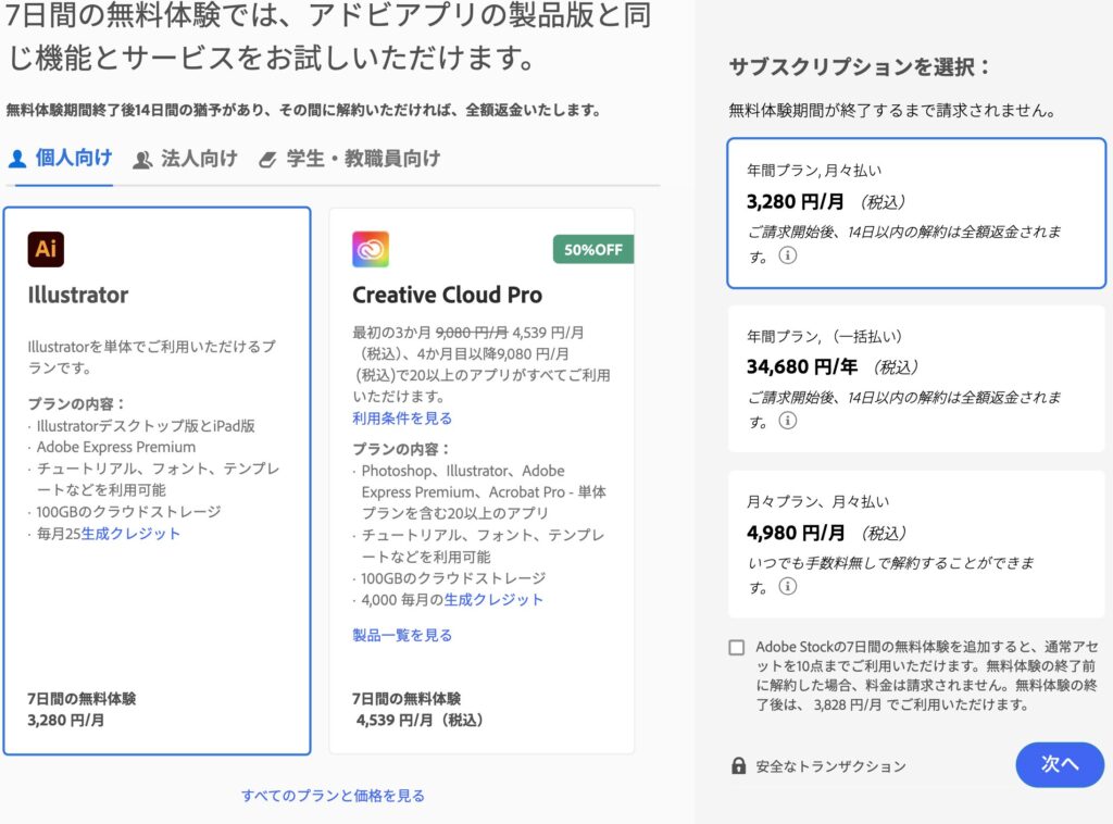 - 「Illustrator単体プラン」または「Creative Cloud」を選択