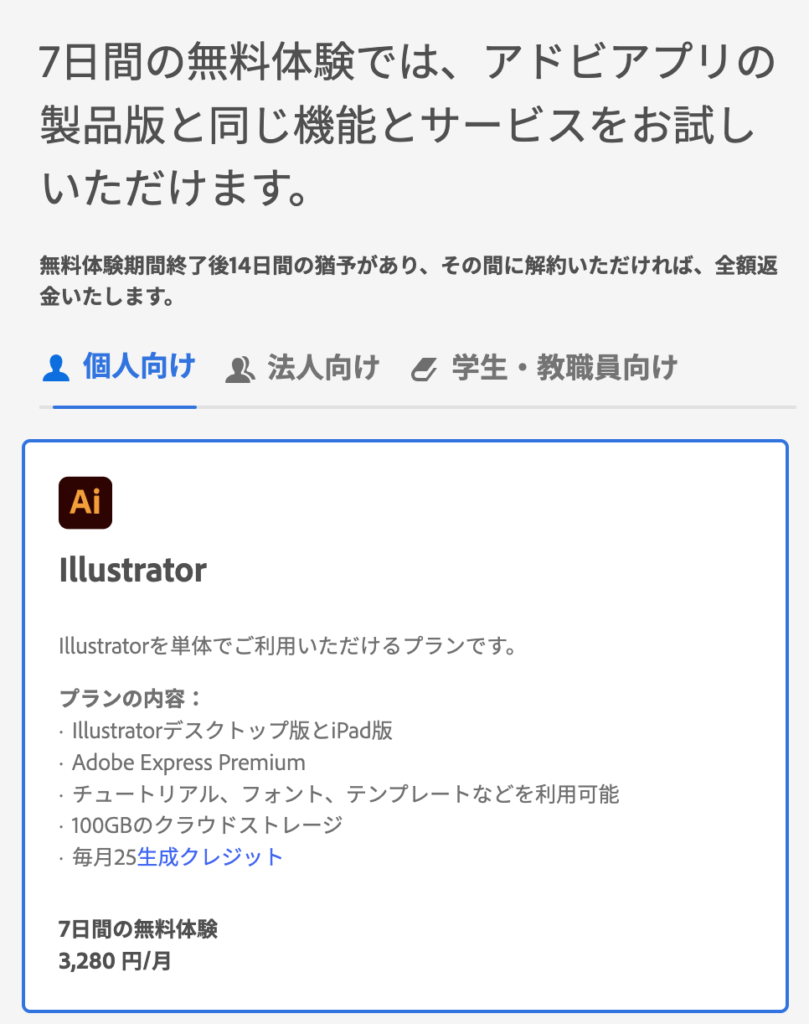 Illustratorは月額や年額といった「サブスクリプション制(定額制)」で利用することができ、対象によってプラン内容も変わりますので確認していきましょう。