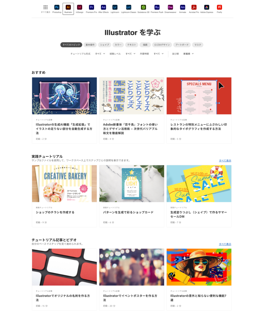公式のチュートリアルはこちらからhttps://www.adobe.com/jp/learn/illustrator?learnIn=1&locale=ja
