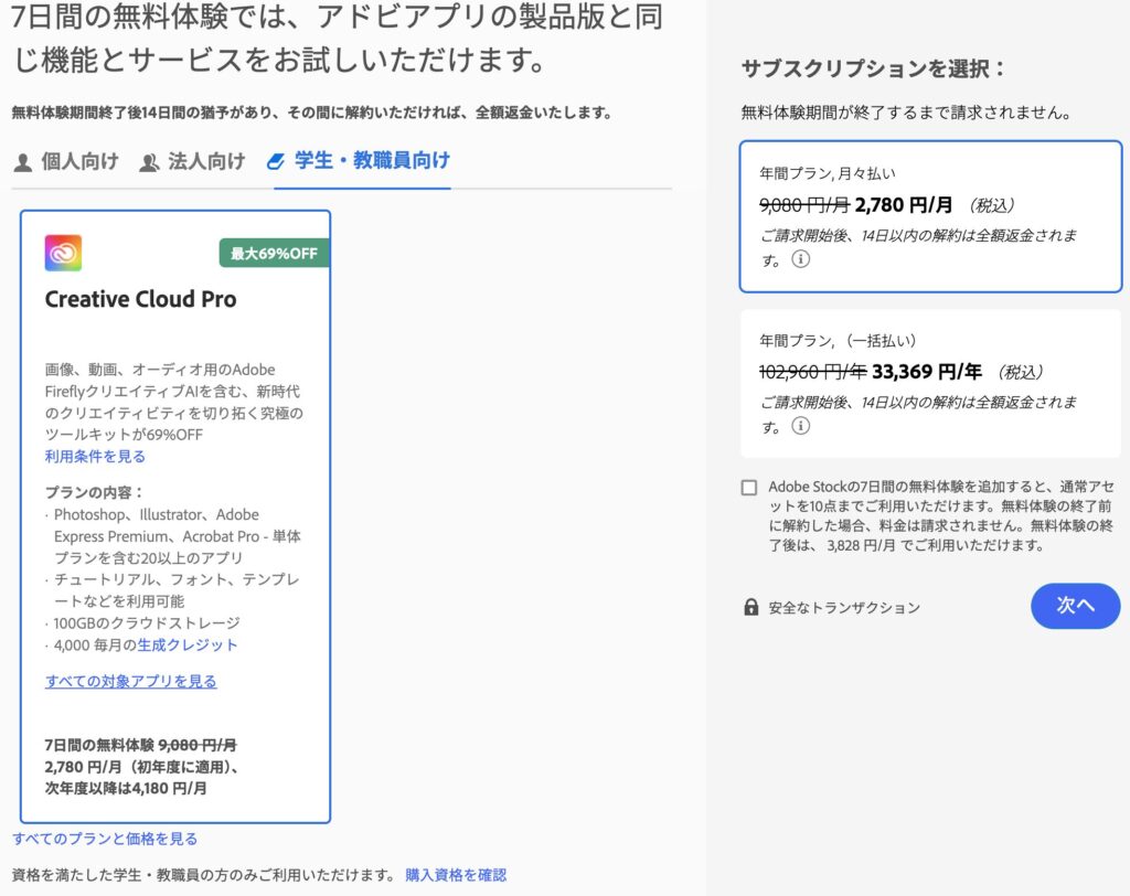 「年間プラン(月々払い)」、「年間プラン(一括払い)」、「月々プラン(月々払い)」 - Adobeアカウントを作成し、支払い方法を登録