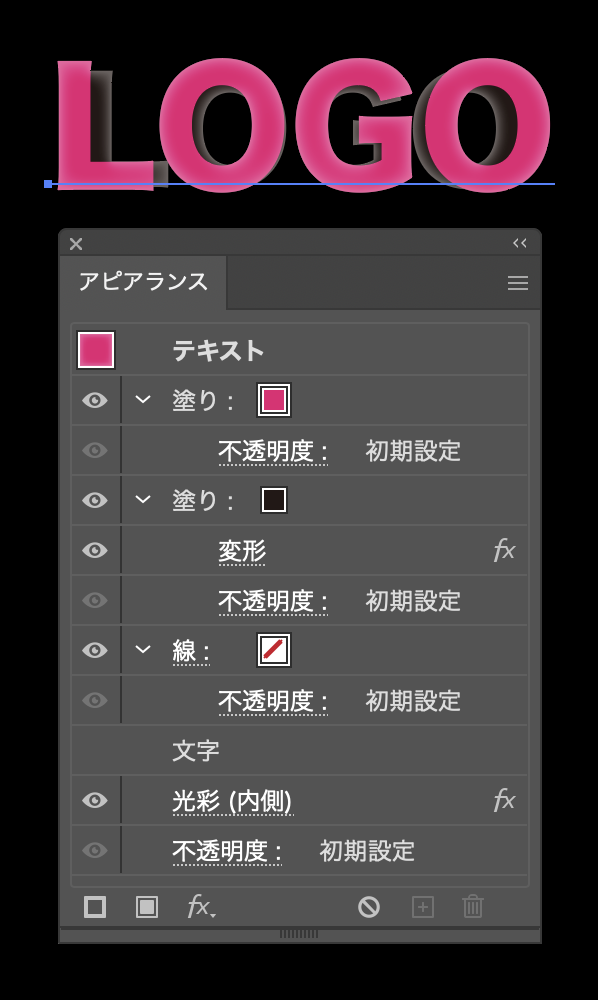 オブジェクト(図形や文字など)の見た目(外観)をコントロールする機能のことで、1つのオブジェクトに対して「塗り」「線」「不透明度」「効果」などを重ねて設定ができます。