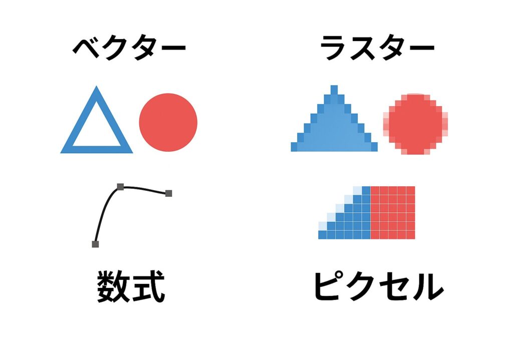 Illustratorが得意とするベクターデザインは、線・曲線・図形などを「数値情報(座標や角度)」で表現し、拡大・縮小しても劣化しないデジタルデザイン手法のこと。